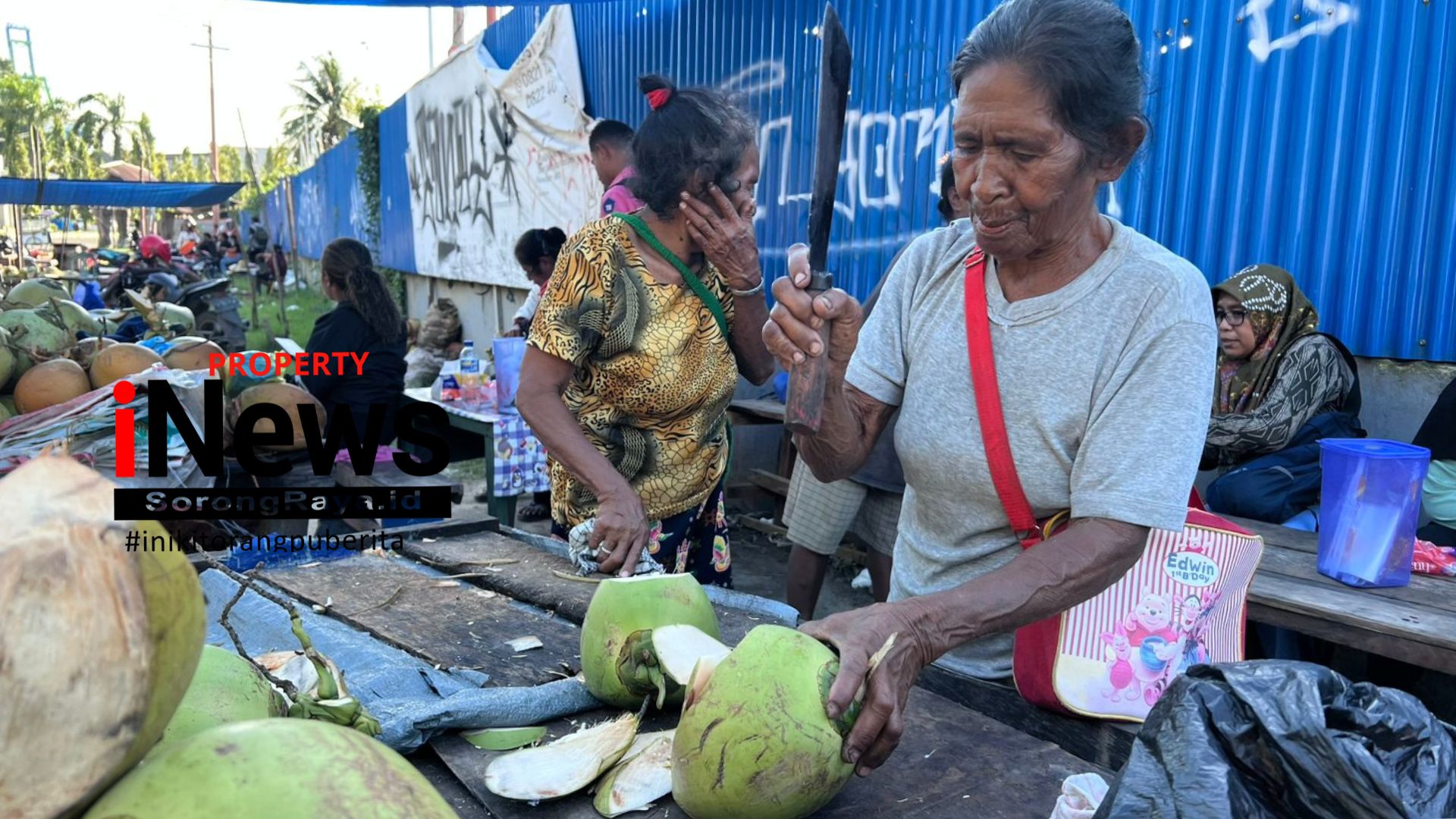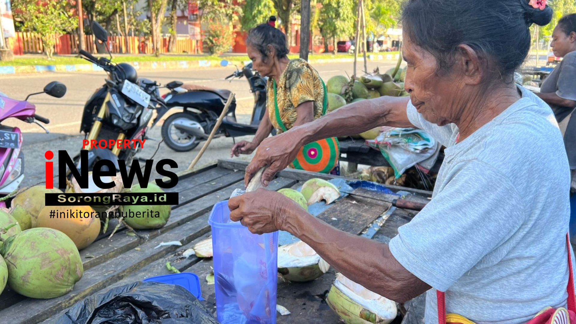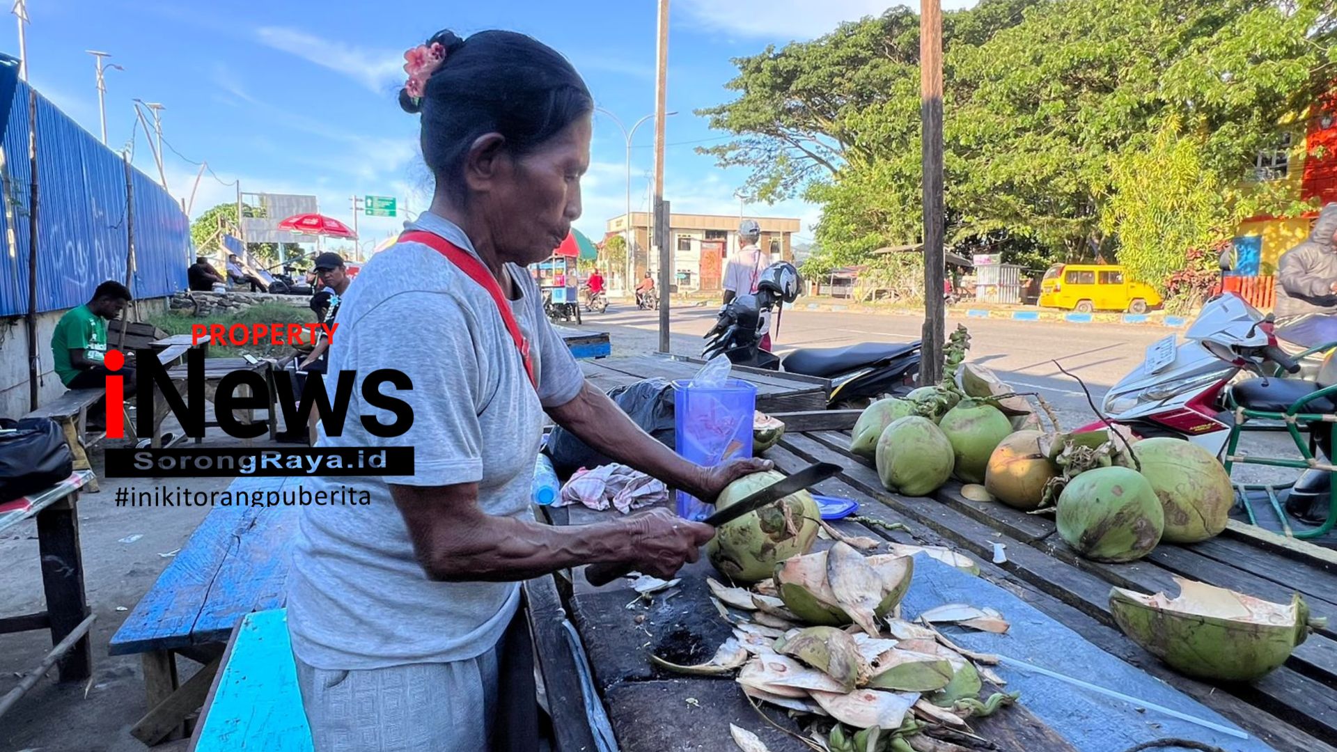 SORONG KOTA, iNewssorongraya.id - Sinar jingga senja di Pantai Tembok Berlin, Kota Sorong, perlahan mulai memantul di wajah keriput Angganita Burdam. Di bawah atap terpal berwarna biru sederhana, tangan tuanya tak henti menata kelapa muda yang baru diangkut dari Pulau Sop. Di balik setiap buah kelapa yang dijualnya, tersimpan kisah perjuangan panjang seorang ibu Papua yang menolak menyerah pada waktu dan perubahan.