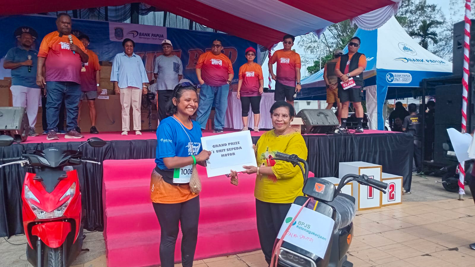 Pemenang lain—Muthalib dan Lisa Mayor—juga membawa pulang motor listrik. Penyerahan hadiah dilakukan langsung oleh Gubernur Kambu, mengundang tawa dan tepuk tangan warga.
