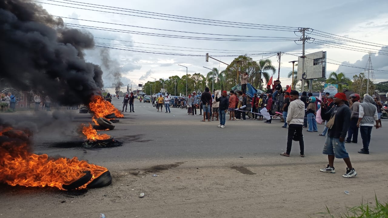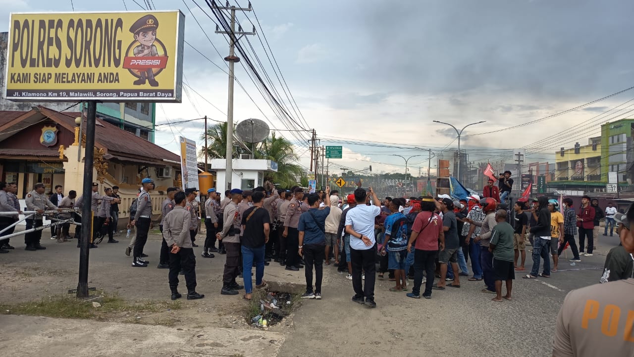 Demonstrasi dimulai sekitar pukul 13.00 WIT dengan titik kumpul di depan Hotel Aquarius, Aimas. Massa kemudian bergerak menuju lampu merah Alun-alun Aimas sekitar pukul 15.00 WIT. Di lokasi itu, peserta aksi membentangkan spanduk tuntutan, membakar ban bekas, dan sempat menutup badan jalan.