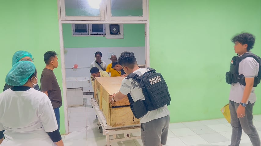 Proses pemindahan jenazah menuju RSUD Sele Be Solu Sorong berlangsung di bawah pengawalan ketat pasukan Brimob dan personel Satreskrim Polres Tambrauw.